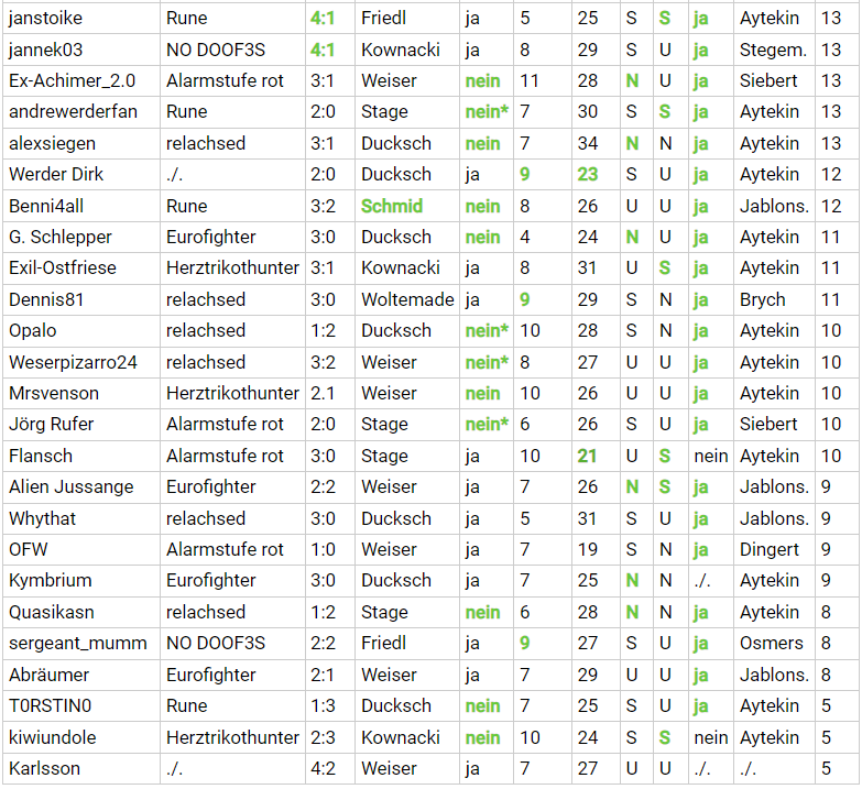 ) sowie eine große Runde Applaus zum letzten Spieltag an das aaaaaaabsolute Gewinner-Team RUNE, die clevererweise den "relachsten" kurz die Wurst vors Gesicht halten, aber frei nach Rudi Assauers "Nur gucken, nicht anfassen!" selbstverständlich auf Platz 1 bleiben, den Teampokal mit nach Hause nehmen und direkt in die Hauswand einbetonieren